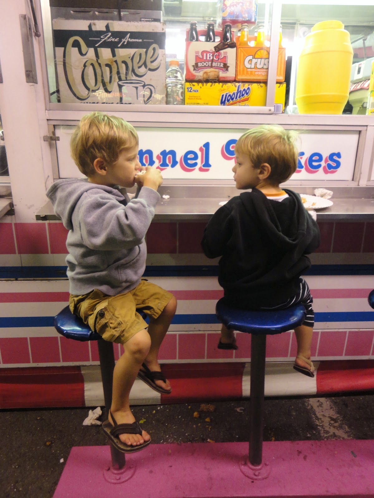 It was sitting here, at the counter of the carnival snack wagon the other night, that I started appreciating the details. I mean, how perfect is it that the snack truck had this little fold-out set of shiny blue barstools to pull up to the counter? They were just the right size for our boys. And I love that they serve sodas in the vintage style glass bottles. They taste so much better that way.