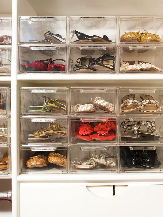 If shoes flood your closet floor, develop a smart strategy for storing them. Keep the shoes you wear all the time accessible on shelves if you have room. Store seasonal and special occasion shoes in easy to see clear plastic boxes on the top shelf of your closet. Or simply reuse the original box and attach a picture of the shoes to the front of the box.