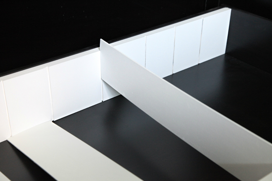 The grooves along each board allowed us to insert thin wooden pieces as dividers (craft/hobby wood found at Home Depot). I asked him to space the grooves a few inches apart to allow us to customize and change the configuration in the future.